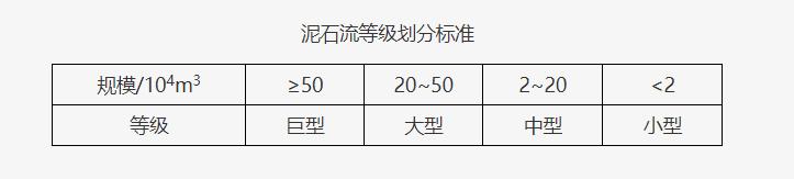 泥石流按照规模可分为巨型、大型、中型、小型4个等级。其划分标准见表。