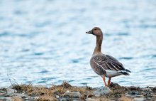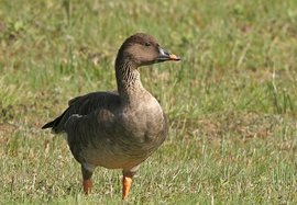 特征:是大型雁类,体长69-80厘米,体重约3千克。外形大小和形状似家鹅。两性相似。头、颈棕褐色,肩、背灰褐色,具淡黄白色羽缘。翅上覆羽和三级飞羽灰褐色;初级覆羽黑褐色,具黄白色羽缘,初级和次级飞羽黑褐色,最外侧几枚飞羽外翈灰色,尾黑褐色,具白色端斑;尾上覆羽白色。喉、胸淡棕褐色,腹污白色,两胁具灰褐色横斑;尾下覆羽白色。虹膜褐色,嘴甲和嘴基黑色,嘴甲和鼻孔之间有一橙黄色横斑沿嘴的两侧边缘向后延伸至嘴角,脚橙黄色,爪黑色。