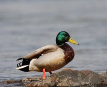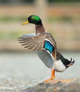 特征:属游禽,大型鸭类。体长47-62厘米,体重大约1千克,外形大小和家鸭相似。雄鸟嘴黄绿色,脚橙黄色,头和颈辉绿色,颈部有一明显的白色领环。上体黑褐色,腰和尾上覆羽黑色,两对中央尾羽亦为黑色,且向上卷曲成钩状;外侧尾羽白色。胸栗色。翅、两胁和腹灰白色,具紫蓝色翼镜,翼镜上下缘具宽的白边,飞行时极醒目。雌鸭嘴黑褐色,嘴端暗棕黄色,脚橙黄色和具有的紫蓝色翼镜及翼镜前后缘宽阔的白边等特征。