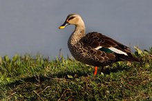 特征:属大型鸭类,体型大小和绿头鸭相似,体长50-64厘米,体重1千克左右。雌雄羽色相似。上嘴黑色,先端黄色,脚橙黄色,脸至上颈侧、眼先、眉纹、颏和喉均为淡黄白色,远处看起来呈白色,与深的体色呈明显反差。
