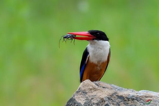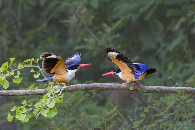 特征:体长雄性278-310毫米,雌性250-310毫米;寿命10年。是一种以蓝色、白色及黑色为主的翡翠鸟。以头黑为特征,翼上覆羽黑色,上体其余为亮丽华贵的蓝紫色。两胁及臀沾棕色。飞行时白色翼斑显见。主要是留鸟,部分为夏候鸟,嘴粗长似凿,基部较宽,嘴峰直,峰脊圆