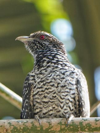 特征:体长39-46厘米,约重350克。属中型鸟类。雄鸟通体黑色,具蓝色光泽,下体沾绿。雌鸟上体暗褐色,略具金属绿色光泽,并满布整齐的白色小斑点;头部白色斑点略沾皮黄色,且较细密,常呈纵纹状排列。背、翅上覆羽及飞羽,以及尾羽常呈横斑状排列。颏至上胸黑色,密被粗的白色斑点,其余下体白色,具黑色横斑。