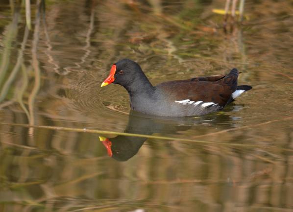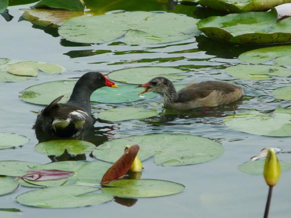特征:中型涉禽,体长24-35厘米。嘴长度适中,鼻孔狭长;头具额甲,后缘圆钝;嘴和额甲色彩鲜艳。翅圆形,第2枚初级飞羽最长,或第2枚和第3枚初级飞羽等长,第1枚约与第5枚或第6枚等长。尾下覆羽白色。趾很长,中趾不连爪约与跗蹠等长。趾具狭窄的直缘膜或蹼。通体黑褐色,嘴黄色,嘴基与额甲红色,两胁具宽阔的白色纵纹,尾下覆羽两侧亦为白色,中间黑色,黑白分明,甚为醒目。脚黄绿色,脚上部有一鲜红色环带,亦甚醒目。游泳时身体露出水面较高,尾向上翘,露出尾后两团白斑很远即能看见。