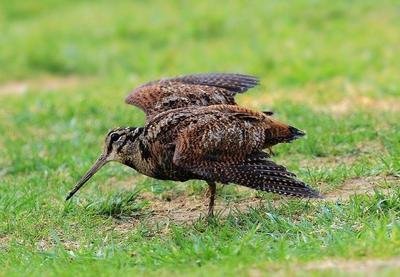 习性:丘鹬在中国主要为冬候鸟,部分夏候鸟。春季最早于3月末4月初迁到东北长白山,秋季于9月初至10月末南迁。主要以鞘翅目、双翅日、鳞翅目昆虫、昆虫幼虫、蚯蚓、蜗牛等小型无脊椎动物为食,有时也食植物根、浆果和种子。觅食多在晚上、黎明和黄昏。觅食时用长嘴插入潮湿泥土中,并摆动头部、探觅蠕虫、蚯蚓和昆虫幼虫。也直接在地面啄食。