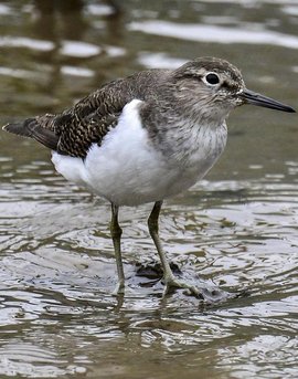 特征:是小型鹬类,体长16-22厘米。嘴、脚均较短,嘴暗褐色,脚淡黄褐色具白色眉纹和黑色过眼纹。上体黑褐色,下体白色,并沿胸侧向背部延伸,翅折叠时在翼角前方形成显著的白斑,飞翔时明显可见尾两边的白色横斑和翼上宽阔的白色翼带,飞翔姿势两翅朝下扇动,身体呈弓状,站立时不住地点头、摆尾。