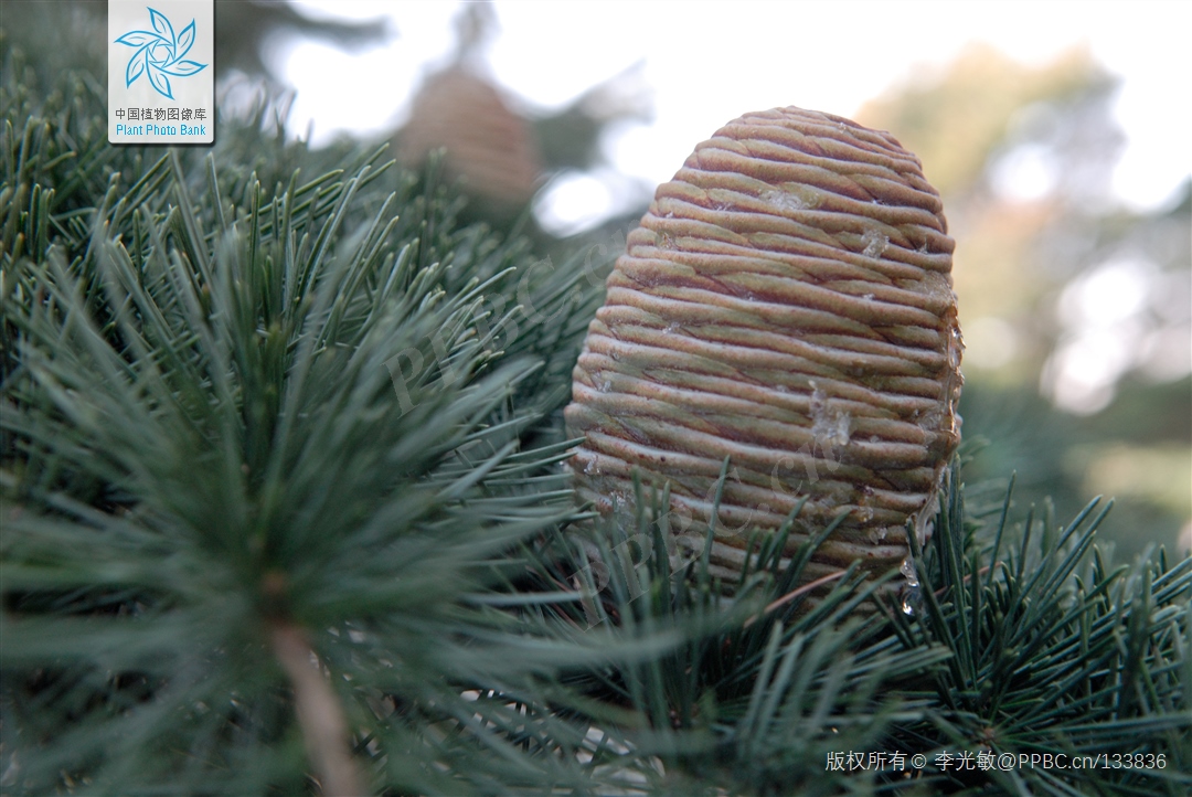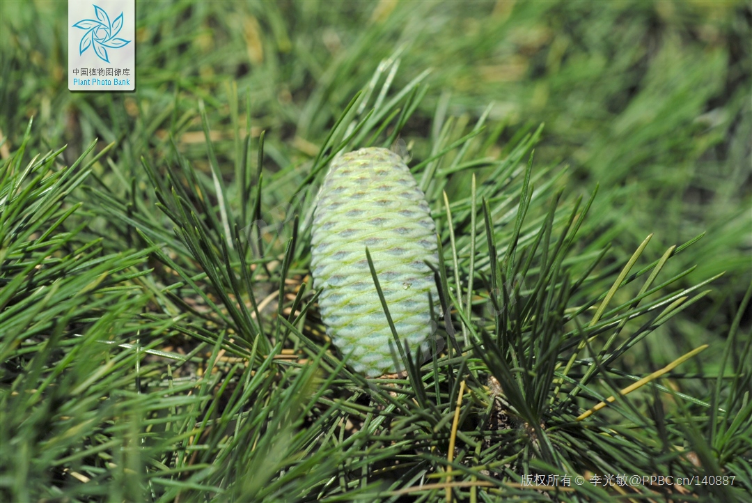 球果卵圆形、宽椭圆形或近球形,长7-12厘米,熟前淡绿色,微被白粉,熟时褐或栗褐色;中部的种鳞长2.5-4厘米,宽4-6厘米,上部宽圆或平,边缘微内曲,背部密生短绒毛;