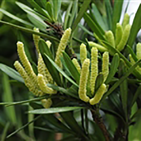 叶螺旋状着生,革质,线状披针形,微弯,长7-12厘米,宽0.7-1厘米,上部微渐窄或渐窄,先端尖,基部楔形,上面深绿色,中脉显著隆起,下面灰绿色,被白粉;雄球花穗状,常2-5族生,长3-5厘米;