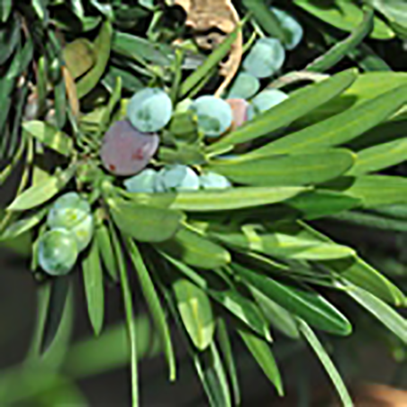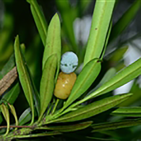 种子卵圆形或近球形,径约1厘米,成熟时假种皮紫黑色,被白粉,肉质种托柱状椭圆形,红或紫红色,长于种子,种柄长于种托,长1-1.5厘米;