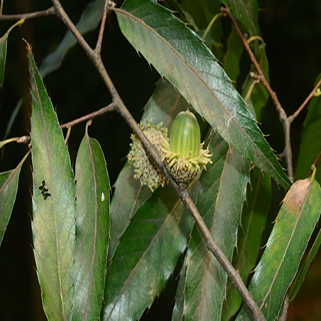 壳斗杯状,连小苞片高约8毫米,径约1.5厘米,小苞片线形,长约5毫米,直伸或反曲,下部小苞片三角状,紧贴;果椭圆形,长1.5-2.5厘米,径1.3-1.5厘米,顶端被微毛;