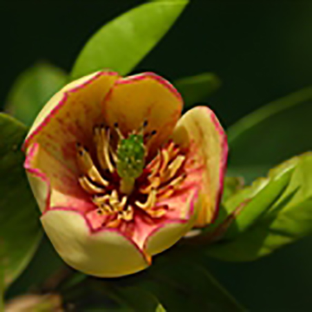 花直立,长12-20毫米,宽6-11毫米,淡黄色而边缘有时红色或紫色,具甜浓的芳香,花被片6,肉质,较肥厚,长椭圆形,长12-20毫米,宽6-11毫米;雄蕊长7-8毫米,药隔伸出成急尖头,雌蕊群无毛,长约7毫米,超出于雄蕊群;雌蕊群柄长约6毫米,被淡黄色绒毛;