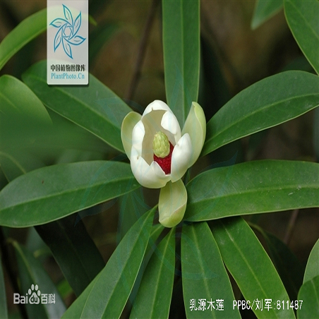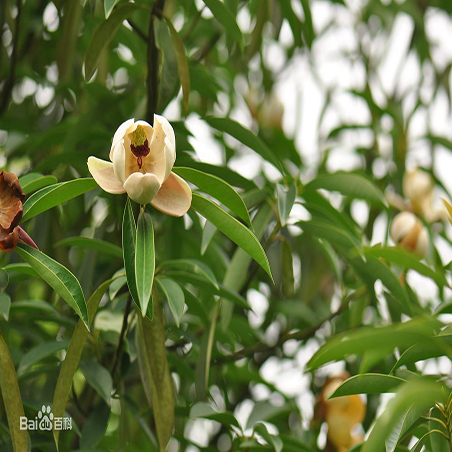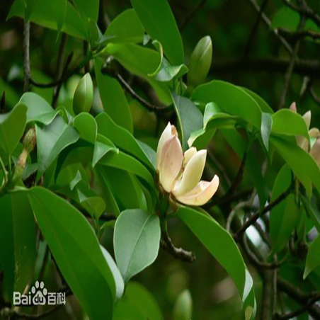 乔木,高达8米,胸径18厘米;树皮灰褐色;枝黄褐色;除外芽鳞被金黄色平伏柔毛外余无毛。叶革质,倒披针形、狭倒卵状长圆形或狭长圆形,长8-14厘米,宽2.5-4厘米,先端稍弯的尾状渐尖或渐尖,基部阔楔形或楔形,上面深绿色,下面淡灰绿色;中脉平坦或稍凹,侧脉每边8-12 (14) 条,纤细;边缘稍背卷;叶柄长1-3厘米,上面具渐宽的沟;托叶痕长3-4毫米。花梗长1.5-2厘米,直径约4毫米,具1环苞片脱落痕;花被片9,3轮,外轮3片带绿色,薄革质,倒卵状长圆形,长约4厘米,宽约2厘米,中轮与内轮肉质,纯白色,中轮倒卵形,长约2.5厘米,宽约2厘米,内轮3片狭倒卵形,长约3厘米,宽约1厘米;雄蕊长4-7毫米,花药长3-5毫米,药隔伸出成近半圆形的尖头,长约1毫米;雌蕊群椭圆状卵圆形,长1.3-1.8厘米,下部心皮狭椭圆形,长7-8毫米,具3-5条纵棱,上部露出面具乳头状凸起,花柱长1-1.5毫米。聚合果卵圆形,熟时褐色,长2.5-3.5厘米。花期5月,果期9-10月。
