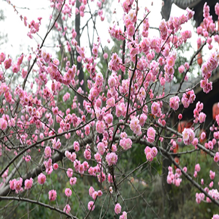 梅原产我国南方,已有三千多年的栽培历史,无论作观赏或果树均有许多品种。许多类型不但露地栽培供观赏,还可以栽为盆花,制作梅桩。鲜花可提取香精,花、叶、根和种仁均可入药。果实可食、盐渍或千制,或熏制成乌梅人药,有止咳、止泻、生津、止渴之效。梅又能抗根线虫危害,可作核果类果树的砧木。