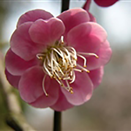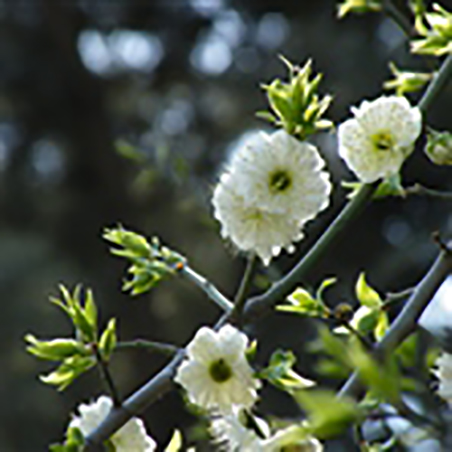 花单生或2朵生于1芽内,径2-2.5厘米,香味浓,先叶开放;花梗长1-3毫米,常无毛;花萼常红褐色,有些品种花萼为绿或绿紫色,萼筒宽钟形,无毛或被柔毛,萼片卵形或近圆形;花瓣倒卵形,白或粉红色;