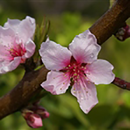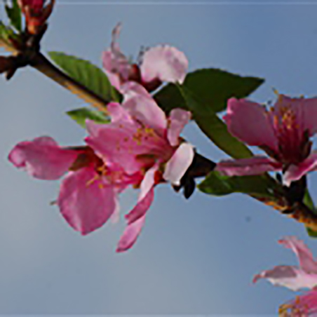 花单生,先叶开放,径2.5-3.5厘米;花梗极短或几无梗;萼筒钟形,被柔毛,稀几无毛,萼片卵形或长圆形,被柔毛;花瓣长圆状椭圆形或宽倒卵形,粉红色,稀白色:花药绯红色;