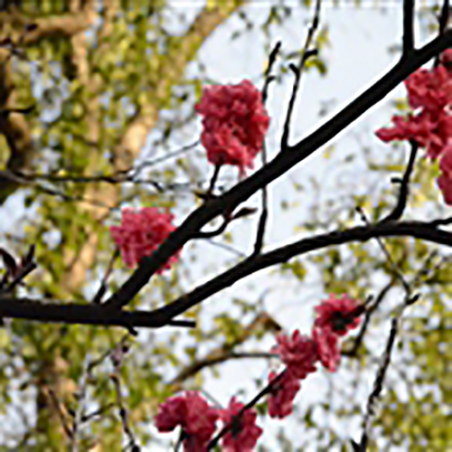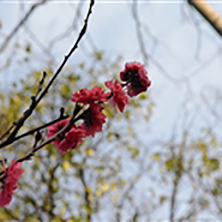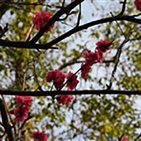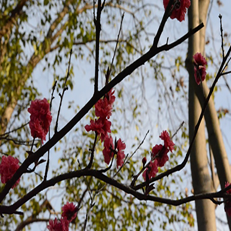 乔木。叶紫色,叶的边缘有细齿,暗绿色有光泽。花单瓣或重瓣,红色。果实近球形,表面有茸毛,肉质可食。