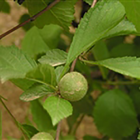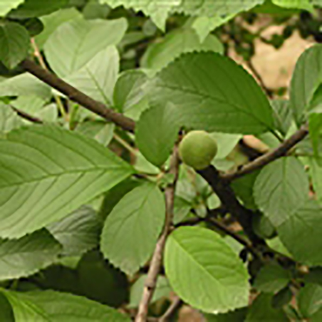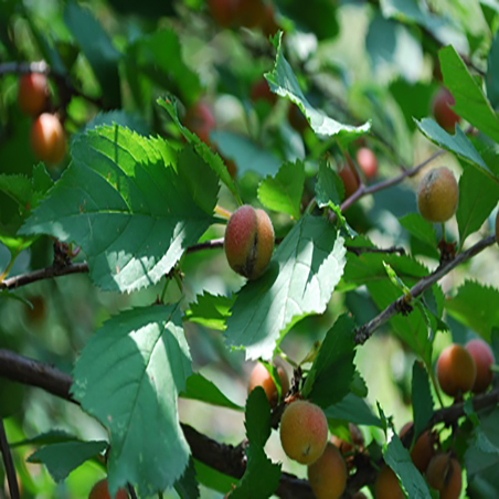 核果近球形,径1-1.8厘米,顶端具小尖头,熟时红色,被柔毛;果柄长0.5-1厘米;果肉薄,熟时开裂;核近球形,具厚硬壳,径1-1.6厘米,两侧几不扁,顶端钝圆,具不整齐网纹;