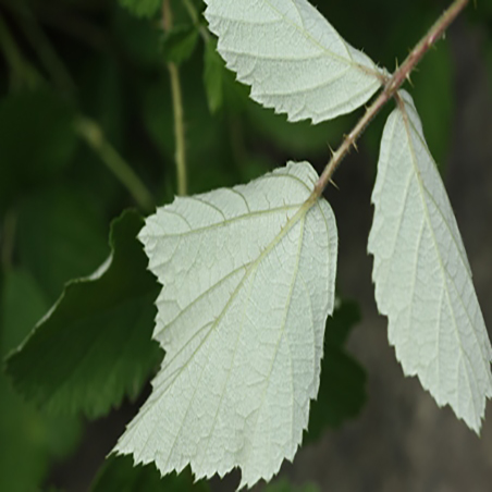 小叶3(5),菱状圆卵形或倒卵形,长2.5-6厘米,上面伏生疏柔毛,下面密被灰白色线毛,有不整齐粗锯齿或缺刻状粗重锯齿,常具浅裂片;叶柄长2.5-5厘米,被柔毛和稀疏小皮刺,托叶线形,被柔毛;