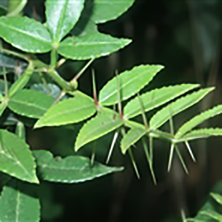 奇数羽状复叶,叶轴、叶柄具翅,下面有时具皮刺,无毛;小叶3-9(-11),对生,纸质,几无柄,披针形、椭圆形或卵形,长3-12厘米,宽1-4.5厘米,先端渐尖,基部楔形或宽楔形,疏生浅齿,或近全缘,齿间或沿叶缘具油腺点,叶下面基部中脉两侧具簇生柔毛,下面中脉常被小刺;