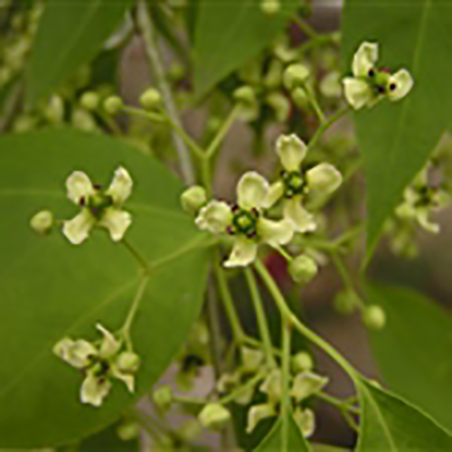 聚伞花序有3至多花;花序梗微扁,长1-2厘米;花4数,淡白绿或黄绿色,径约8毫米;花萼裂片半圆形;花瓣长圆状倒卵形;雄蕊生于4圆裂花盘上,花丝长1-2毫米,花药紫红色;子房四角形,4室,每室2胚珠; |