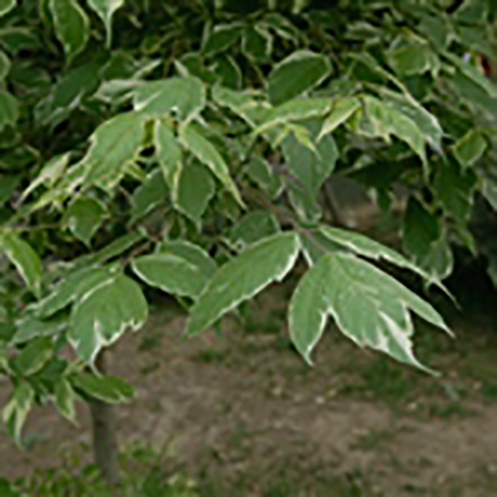 羽状复叶,小叶3-5(7-9),小叶纸质,卵圆形或椭圆状披针形,长8-10厘米,宽2-4厘米,先端渐尖,基部楔形,具3-5对粗锯齿,下面淡绿色,脉腋被族生毛,侧脉5-7对;叶柄长5-7厘米;