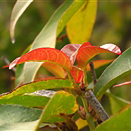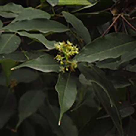 叶厚革质,披针形、卵状披针形、稀卵形或长椭圆形,基部钝形或近于圆形,先端渐尖或钝尖,全缘,长6-8.5厘米,宽2.5-3.5厘米,无毛,上面绿色,有光泽,很平滑,下面淡白色,略被白粉;主脉在上面显著,在下面凸起,侧脉5-7对,在上面不显著,在下面略显著,未达于边缘以前即隐匿不现,基生的1对常达于叶片的中段,小叶脉不发育;叶柄细瘦,紫绿色,无毛,长1-1.5厘米; |