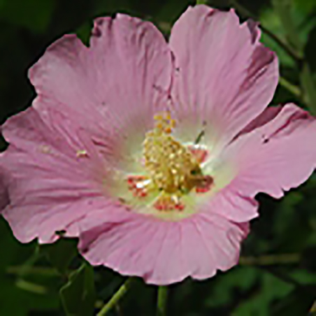 花单生枝端叶腋;花梗长5-8厘米,近顶端具节;小苞片8,线形,长1-1.6厘米,宽约2毫米,密被星状绵毛,基部合生;花萼钟形,长约3厘米,裂片5,卵形,先端渐尖;花冠初白或淡红色,后深红色,径约8厘米,花瓣5,近圆形,基部具髯毛;雄蕊柱长2-3厘米,无毛;花柱分枝5,疏被柔毛,柱头头状;