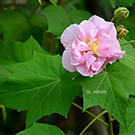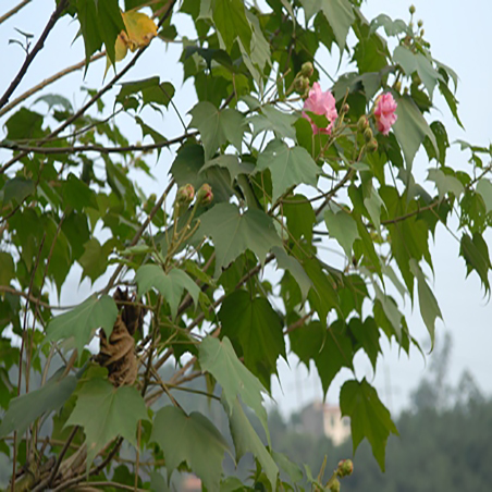 叶卵状心形,径10-15厘米,常5-7裂,裂片三角形,先端渐尖,具钝圆锯齿,上面疏被星状毛和细点,下面密被星状细绒毛,掌状脉5-11;叶柄长5-20厘米,托叶披针形,长5-8毫米,常早落;