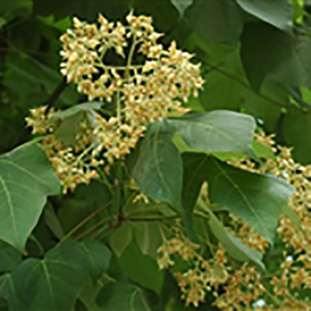 圆锥花序顶生,长20-50厘米;花淡黄绿色花萼5深裂近基部,萼片线形,外卷,长7-9毫米,被淡黄色柔毛,内面基部被柔毛;花梗与花近等长;雄花的雌雄荡柄与花萼等长,无毛,花药15枚不规则聚集在雌雄蕊柄的顶端,退化子房梨形且甚小;雌花子房球形,被毛;