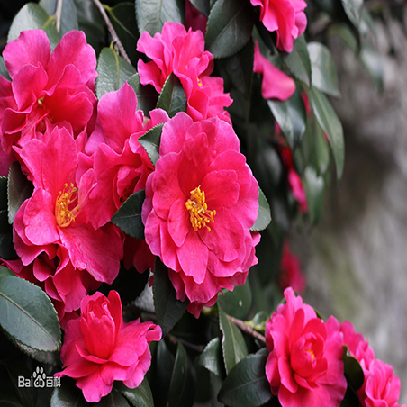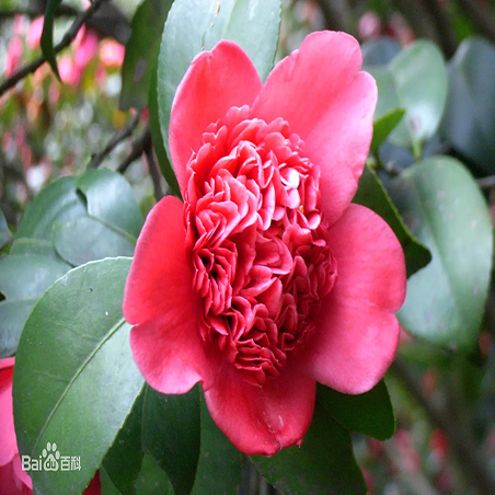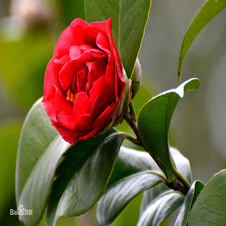 山茶是灌木或小乔木植物,高约9米,嫩枝无毛。叶革质,椭圆形,长5-10厘米,宽2.5-5厘米,先端略尖,或急短尖而有钝尖头,基部阔楔形,上面深绿色,干后发亮,无毛,下面浅绿色,无毛,侧脉7-8对,在上下两面均能见,边缘有细锯齿 。叶柄长8-15毫米,无毛。花顶生,红色,无柄;苞片及萼片约10片,组成长约2.5-3厘米的杯状苞被,半圆形至圆形,长4-20毫米,外面有绢毛,脱落;花瓣6-7片,外侧2片近圆形,几离生,长2厘米,外面有毛,内侧5片基部连生约8毫米,倒卵圆形,长3-4.5厘米,无毛;雄蕊3轮,长约2.5-3厘米,外轮花丝基部连生,花丝管长1.5厘米,无毛;内轮雄蕊离生,稍短,子房无毛,花柱长2.5厘米,先端3裂。蒴果圆球形,直径2.5-3厘米,2-3室,每室有种子1-2个,3爿裂开,果爿厚木质。花期1-4月。