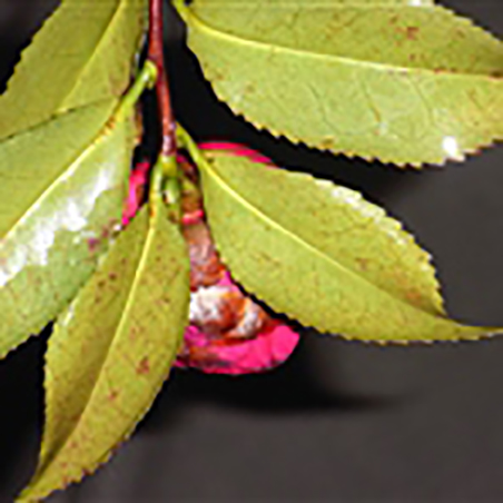 叶革质,椭圆形,长3-5厘米,宽2-3厘米,先端短尖,基部楔形,有时略圆,上面干后深绿色,发亮,下面褐绿色,无毛,侧脉5-6对,在上面不明显,在下面能见,网脉不显著;边缘有细锯齿,叶柄长4-6毫米,稍被残毛;