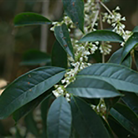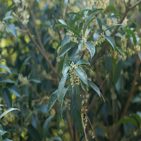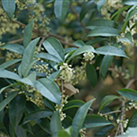 聚伞花序簇生于叶腋,或近于帚状,每腋内有花多朵;苞片宽卵形,质厚,长2-4毫米,具小尖头,无毛;花梗细弱,长4-10毫米,无毛;花极芳香;花萼长约1毫米,裂片稍不整齐;花冠黄白色、淡黄色、黄色或桔红色,长3-4毫米,花冠管仅长0.5-1毫米;雄蕊着生于花冠管中部,花丝极短,长约0.5毫米,花药长约1毫米,药隔在花药先端稍延伸呈不明显的小尖头;雌蕊长约1.5毫米,花柱长约0.5毫米。
