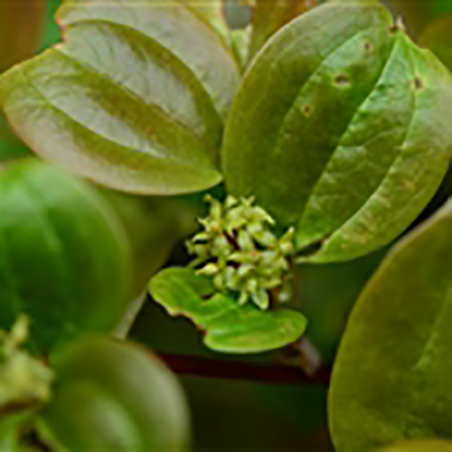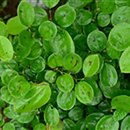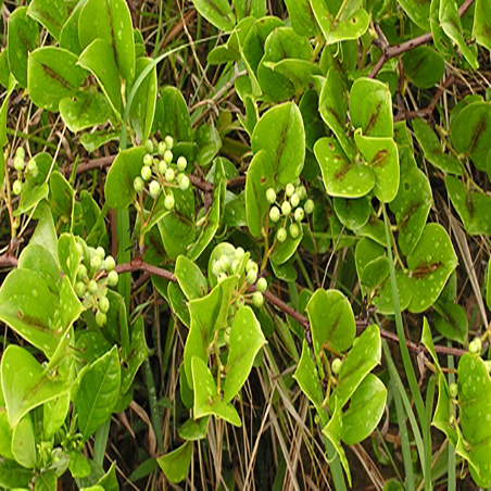 叶薄革质,干后常红褐或近古铜色,圆形、卵形或宽卵形,长3-10厘米,下面粉霜多少可脱落,常淡绿色;叶柄长0.5-1.5厘米,鞘一侧宽0.5-1毫米,长为叶柄1/2-2/3,与叶柄近等宽,几全部具卷须,脱落点近卷须;