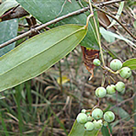 叶薄革质,窄椭圆状披针形,长6-15厘米,宽1-7厘米,下面常绿色,有时带苍白色;叶柄长0.5-1.5厘米,窄鞘长为叶柄3/5-1/4,有卷须,脱落点位于近顶端;