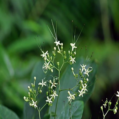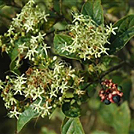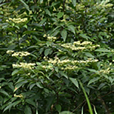 伞房状聚伞花序,径20-25厘米;苞片线形;花萼杯状,被黄褐色细绒毛及腺点,长3-4毫米;花冠白色,疏被微柔毛及腺点,冠筒长约1厘米,裂片卵形;