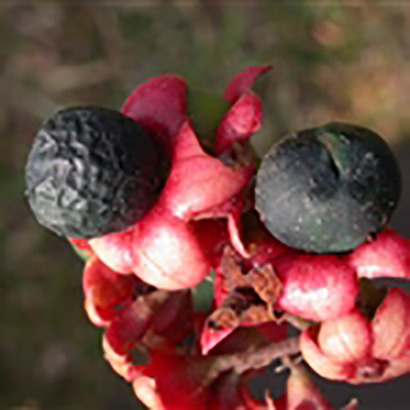 核果球形或倒卵圆形,径0.5-1厘米,蓝紫色,为红色宿萼所包;