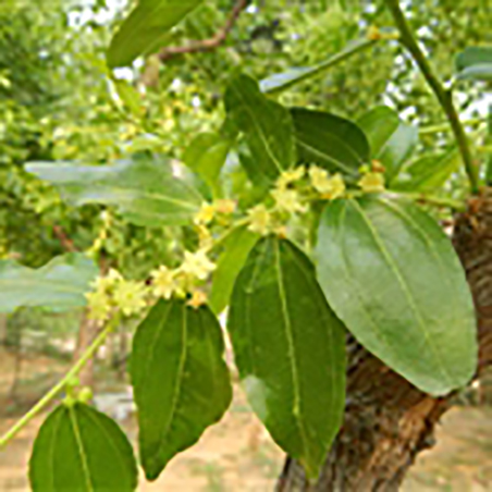 花黄绿色,两性,5基数,无毛,具短总花梗,单生或2-8个密集成腋生聚伞花序;花梗长2-3毫米;萼片卵状三角形;花瓣倒卵圆形,基部有爪,与雄蕊等长;花盘厚,肉质,圆形,5裂;子房下部藏于花盘内,与花盘合生,2室,每室有1胚珠,花柱2半裂;