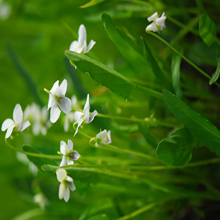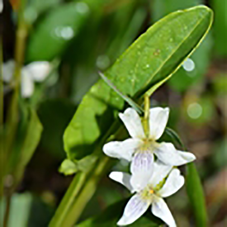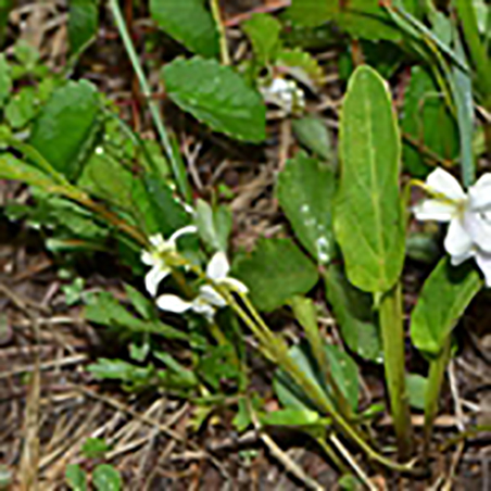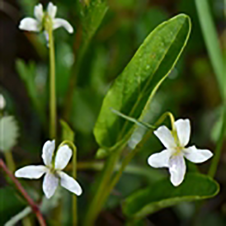 花白色,带淡紫色脉纹;花梗高于叶或与叶近等长,无毛或疏生毛;萼片卵状披针形或披针形,基部附属物短而钝;上方花瓣倒卵形,长约1.2厘米,基部较窄,侧瓣长圆状倒卵形,内面基部有细须毛,下瓣连距长约1.3厘米,距浅囊状;柱头顶部三角形,两侧具较窄的缘边,前方具斜生短喙,柱头孔较细;