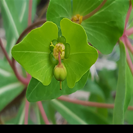 花序单生,有梗或近无梗;总苞钟状,无毛,边缘5裂,裂片半圆形,边缘和内侧具柔毛,腺体4,盘状,中部内凹,盾状着生于总苞边缘,具短柄,淡褐色;雄花数枚,伸出总苞;雌花1,子房柄微伸出总苞边缘;