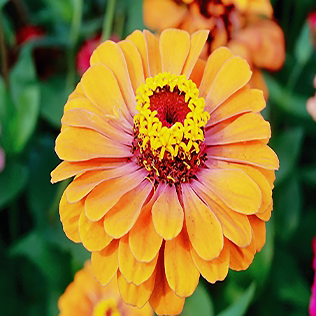头状花序径5-6.5厘米,单生枝端,花序梗不肥壮;总苞宽钟状,总苞片多层,宽卵形或卵状椭圆形,外层长约5毫米,内层长约1厘米,边缘黑色;托片附片紫红色,流苏状三角形;舌状花深红、玫瑰、紫堇或白色,舌片倒卵圆形,先端2-3齿裂或全缘,上面被短毛,下面被长柔毛;管状花黄或橙色,顶端裂片卵状披针形,上面被黄褐色密茸毛;