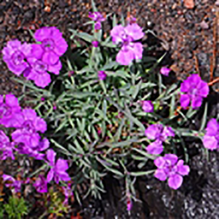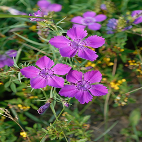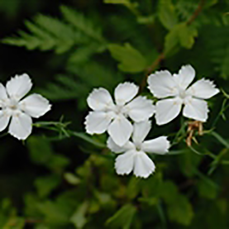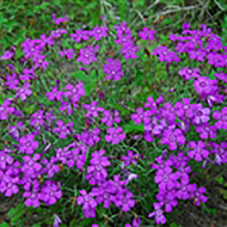花单生或成聚伞花序;花梗长1-3厘米;苞片4,卵形,长渐尖,长达花萼1/2以上;花萼筒形,长1.5-2.5厘米,径4-5毫米,具纵纹,萼齿披针形,长约.5毫米,先端尖;花瓣长1.6-1.8厘米,瓣片倒卵状三角形,长1.3-1.5厘米,紫红、粉红、鲜红或白色,先端不整齐齿裂,喉部具斑纹,疏生髯毛;雄蕊筒形,包于宿萼内,顶端4裂;