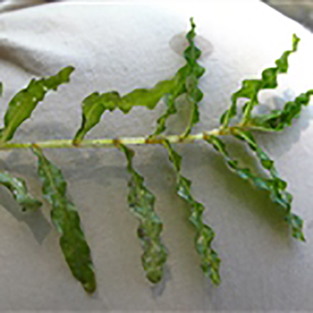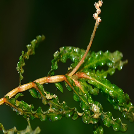 叶条形,长3-8厘米,宽0.5-1厘米,先端钝圆,基部约1毫米与托叶合生,不形成叶鞘,叶缘多少浅波状,具细锯齿,叶脉3-5,平行,顶端连接,中脉近基部两侧伴有通气组织形成的细纹;无柄,托叶薄膜质,长0.5-1厘米,早落;休眠芽腋生,松果状,长1-3厘米,革质叶2列密生,基部肥厚,坚硬,具细齿;
