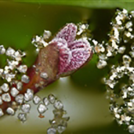 花单性,雌雄异株;雄佛焰苞圆锥形,长1-1.5厘米,具雄花300-800朵,佛焰苞梗长2-6厘米;雄花小;萼片3,不等大;花瓣2,膜质,着生花丝基部;雄蕊2;雌佛焰苞扁筒形,长1-2厘米,顶端2裂,苞内具1雌花,佛焰苞梗细长,受精后卷曲;萼片3,长圆形,长约4毫米汞柱花瓣3,极小;花柱3,2深裂,裂缝基部具退化雄蕊,子房三棱状圆柱形,胚珠多数;