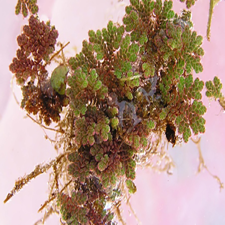 叶小如芝麻子,互生,无柄,覆瓦状在茎枝排成2行;叶片背裂片长圆形或卵形,肉质,绿色,秋后随气温降低渐变为红色,边缘无色透明,上面密被乳头状瘤突,下面中部略凹陷,基部肥厚形成共生腔;腹裂片贝壳状,无色透明,稍紫红色,斜沉水中;