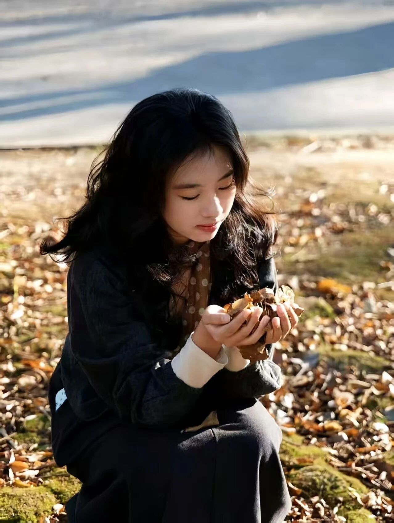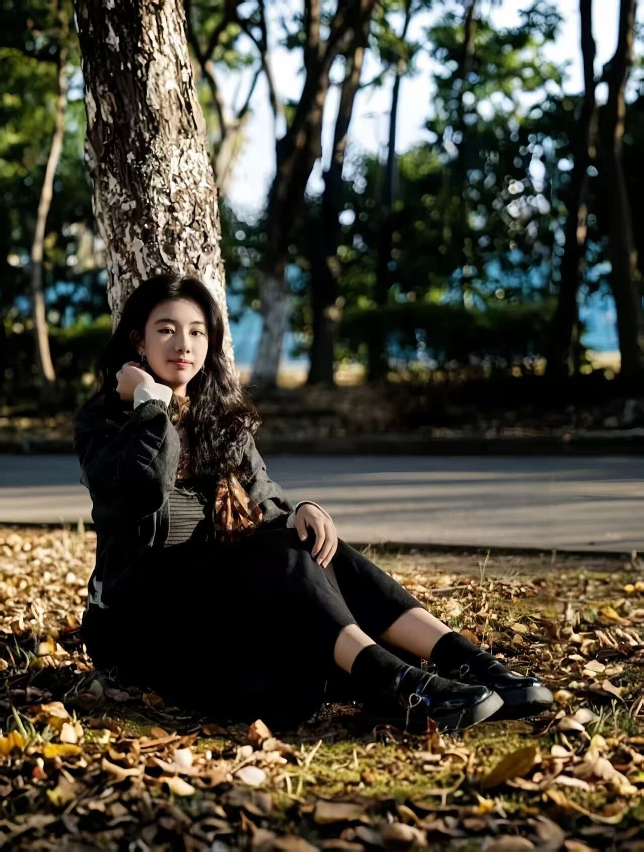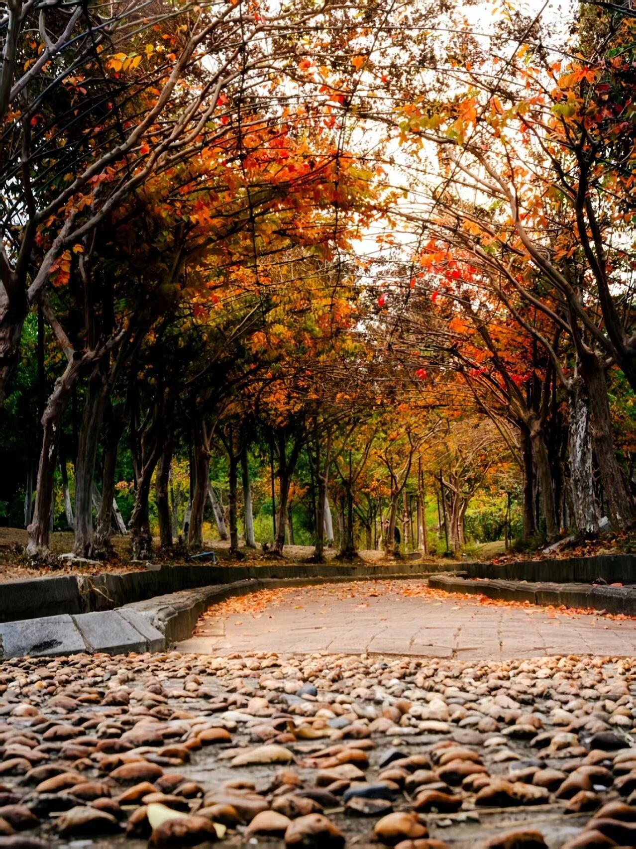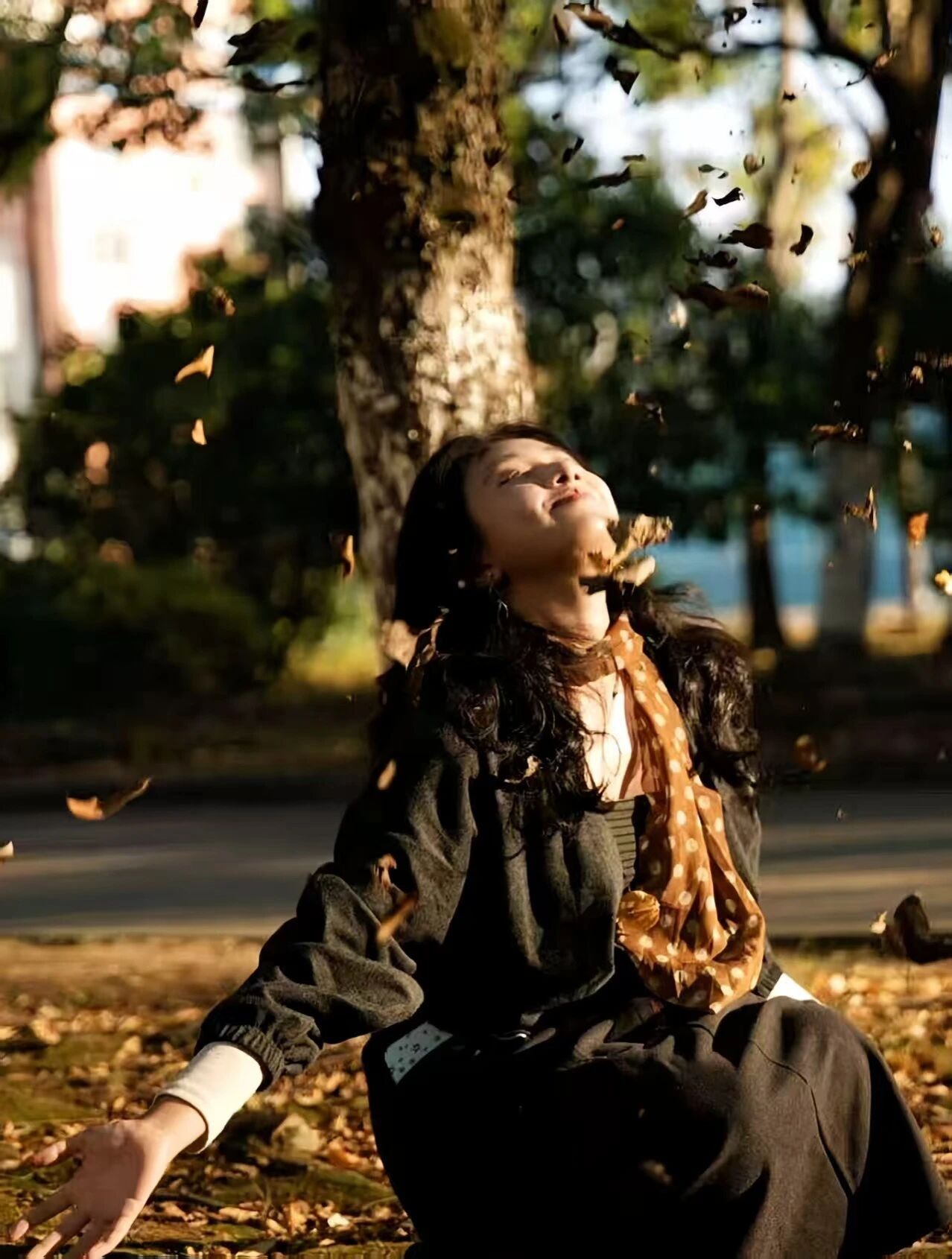 信步铺满落叶的大道上