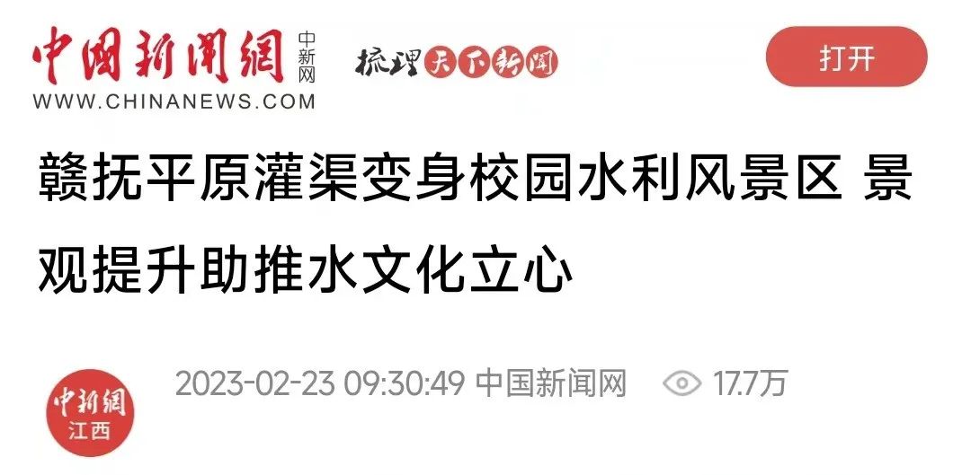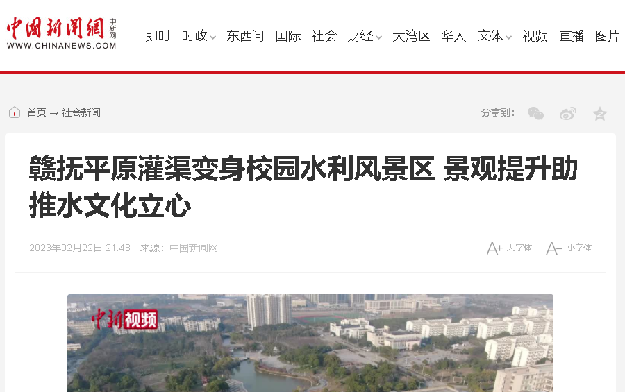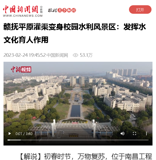 近日,中国新闻社持续关注我校打造全国首家省级校园水利风景区——瑶湾水利风景区,提升文化育人功能,并进行深入报道。自2月22日晚上9时48分推出第一条报道以来,中新网APP头条、中国新闻网等平台连续推出图文报道和视频采访,引发热烈关注,不到48小时累计超过110万访问量,24日视频新闻推出不到12小时即超50万访问量,体现了师生、校友和社会各界人士对学校践行习近平生态文明思想和校园文化育人举措的高度认同,以及对学校和瑶湾水利风景区未来发展的美好期待和良好祝愿。