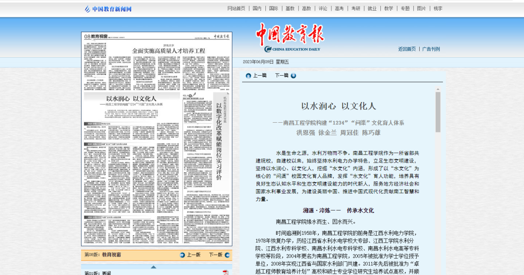 近日,中国教育报以《以水润心以文化人——南昌工程学院构建“1234”“问渠”文化育人体系》为题,报道我校“问渠”文化育人成果。文章指出,南昌工程学院始终坚持水利电力办学特色,落实立德树人根本任务,立足生态文明建设,坚持以水润心、以文化人,挖掘“水文化”内涵,形成了以“水文化”为核心的“问渠”校园文化育人品牌,发挥“水文化”育人功能,培养具有良好生态认知水平和生态文明建设能力的时代新人,服务地方经济社会和国家水利事业发展,为建设美丽中国、推进中国式现代化贡献南工智慧和力量。