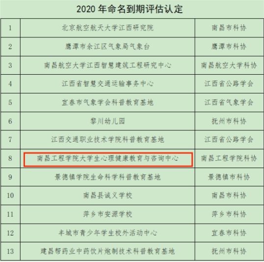 近日,江西省科学技术协会发布《关于命名江西省科普教育基地的通知》,我校大学生心理健康教育与咨询中心完成2023年科普教育基地评估认定工作,再次被评为“江西省科普教育基地”,命名周期为3年(2024-2026年)。