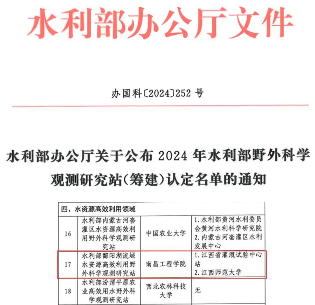 近日,水利部办公厅公布2024年野外科学观测研究站(筹建)认定名单,我校申报的水利部鄱阳湖流域水资源高效利用野外科学观测研究站(以下简称“鄱阳湖野外站”)获批。鄱阳湖野外站由水利部国际合作与科技司负责指导和管理,水利部机关有关司局是其业务指导单位,是江西省第一个水利部野外科学观测研究站。