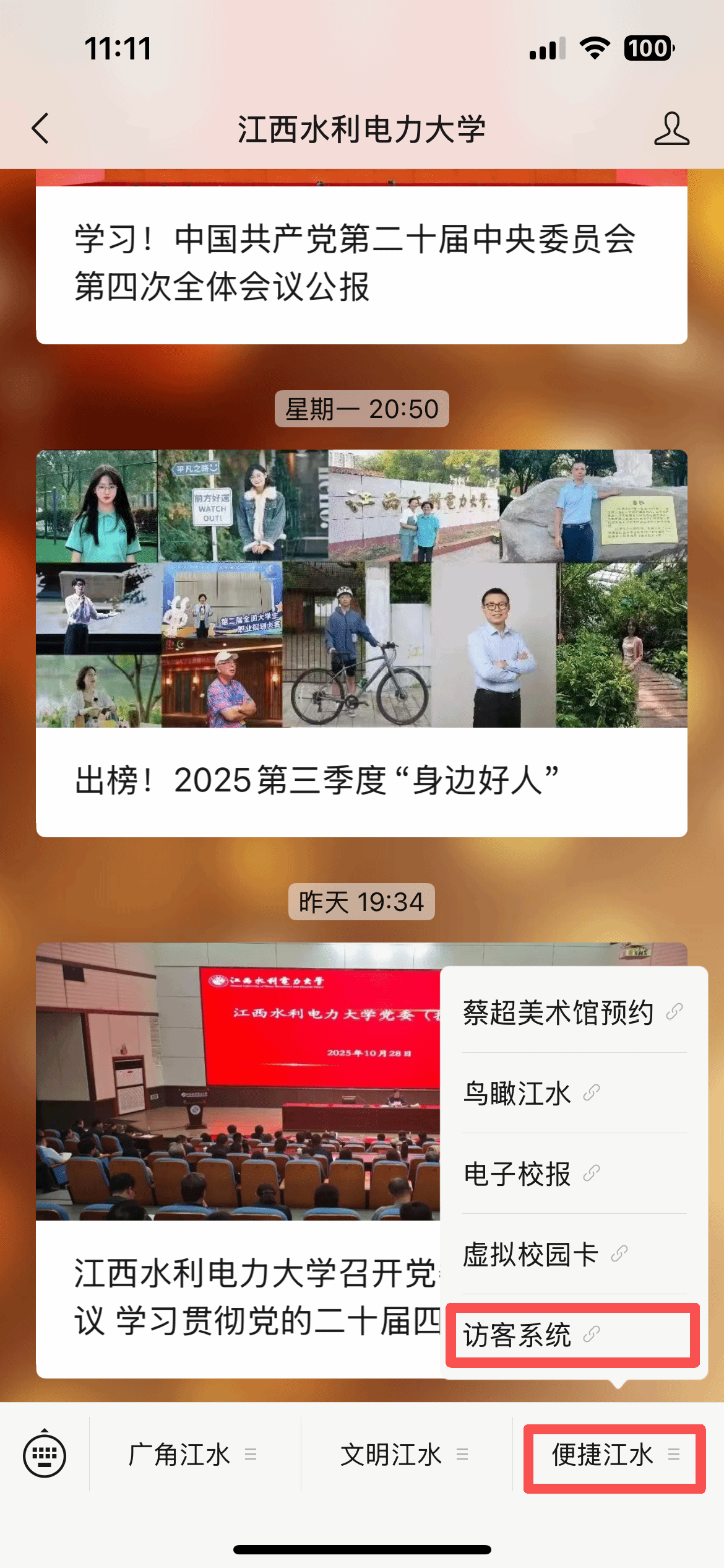 1.校外访客在微信公众号搜索“江西水利电力大学”——右下角“便捷江水”——访客系统——输入手机号码、验证码——进入“入校申请”——填写访客信息。或是直接用手机扫描“访客申请二维码”进入。